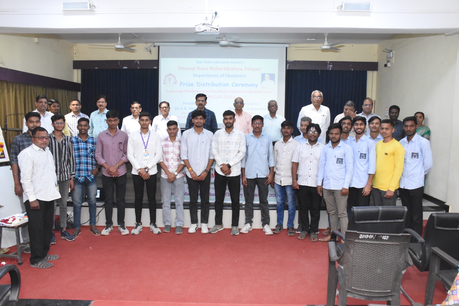 येथील तापी परिसर विद्या मंडळ संचलित, धनाजी नाना महाविद्यालयातील रसायनशास्त्र विभाग आयोजित, लोकसेवक मधुकरराव चौधरी केमिस्ट्री ऍप्टिट्यूड टेस्ट 2025-26 चा पारितोषिक वितरण समारंभ दिनांक 11/03/ 2026 रोजी संपन्न झाला. या परीक्षे मध्ये एकूण 25 महाविद्यालतील 337 विध्यार्थ्यांनी सक्रिय सहभाग नोंदविला.सदरील कार्यक्रमाचे अध्यक्ष म्हणून तापी परिसर विद्या मंडळाचे उपाध्यक्ष प्रा.डॉ.एस. के. चौधरी तसेच प्रमुख पाहुणे म्हणून मा.प्रा. डॉ. गुणवंत हरी सोनवणे चेअरमन- रसायनशास्त्र अभ्यास मंडळ क.ब. चौ.उ.म.वि. जळगांव त्यासोबत तापी परिसर विद्यामंडळाचे चेअरमन- श्री लीलाधर विश्वनाथ चौधरी, सचिव- श्री. मुरलीधर टी. फिरके, सहसचिव-श्री.नंदकुमार आसाराम भंगाळे, कार्यकारी सदस्य माजी प्राचार्य डॉ. एस.एस.पाटील, मा.श्री. संजय दादा चौधरी, महाविद्यालयाचे प्राचार्य डॉ. राजेंद्र बी. वाघुळदे, उपप्राचार्य प्रा. एम. झेड. सुरवाडे व प्रा. कल्पना पाटील उपस्थित होते. कार्यक्रमाचे सूत्रसंचालन डॉ. पल्लवी भंगाळे व प्रा.नाहीदा कुरेशी यांनी केले. तर प्रास्ताविक व पाहुण्यांचा परिचय डॉ. योगेश तायडे यांनी केले. सदरील कार्यक्रमांमध्ये कु. नंदा आनंदा बाविस्कर श्री.वि.एस. नाईक कॉलेज, रावेर यांनी लोकसेवक मधुकरराव चौधरी केमिस्ट्री ऍप्टिट्यूट टेस्ट याचे विशेष महत्त्व आहे व ही परीक्षा वेगवेगळ्या स्पर्धा परीक्षेची तयारी करण्यासाठी खूपच उपयुक्त आहे असे तिने आपल्या मनोगतातून सांगितले. त्याचप्रमाणे स्थानिक समन्वयक डॉ.जयंत प्रल्हाद नेहेते सरदार वल्लभभाई पटेल कॉलेज, ऐनपुर यांनी आपल्या मनोगतातून स्वतः विद्यार्थी स्वतःचे मूल्यांकन करता असे नमूद केले.सदरील कार्यक्रमाचे प्रमुख पाहुणे प्रा.गुणवंत सोनवणे यांनी आपल्या भाषणात रसायनशास्र विषय हा रोजगार देणारा व व्यवसायभिमुक आहे या परीक्षेमध्ये खालील विद्यार्थ्यांचा संस्थेचे उपाध्यक्ष माननीय श्री. एस. के. चौधरी व सर्व संचालक मंडळ, तापी परिसर विद्या मंडळ व विभाग प्रमुख प्रा. डी. बी. तायडे यांच्या हस्ते सत्कार करण्यात आला.