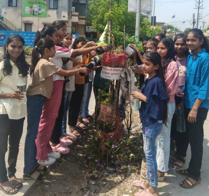 वसुंधरा दिनानिमित्त संत ज्ञानेश्वर विद्यालयातील विद्यार्थ्यांनी परिसरातील झाडांना पाणी देत जनजागृती