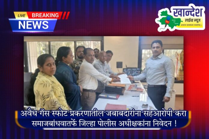 जळगाव खान्देश लाईव्ह न्यूज प्रतिनिधी – जळगाव शहरातील इच्छादेवी पोलीस चौकीजवळील अवैध गॅस रिफिलिंग सेंटरवर झालेल्या स्फोटातील काही पोलीस कर्मचारी तसेच या घटनेला कारणीभूत ठरलेल्या गॅस एजन्सीचे चालक, मालक यांना या गुन्ह्यात सहआरोपी करावे, अशा आशयाची मागणी राणा राजपूत समाज सुधारक मंडळ, समस्त राणा राजपूत समाज बांधव यांनी जिल्हा पोलीस अधीक्षक यांना निवेदन देवुन केली आहे.